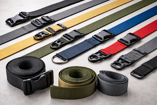 Production begins with approved webbing materials. Nylon, polypropylene, or polyester web strapping is reviewed before cutting starts. Straps are then cut to the required length and width based on product specifications.